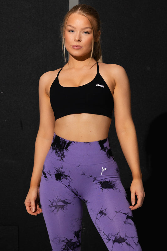 Seamless tights in a stretchy material with a flattering tie dye pattern. The training tights have a nice scrunch seam that accentuates the shape. Light and comfortable fabric that effectively transports moisture. The tights are well suited for strength training, yoga and everyday wear.