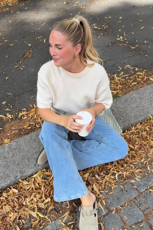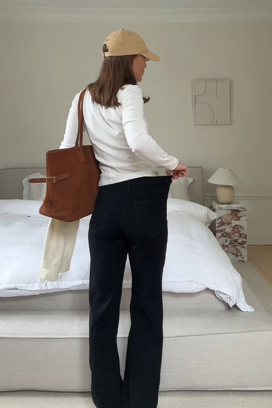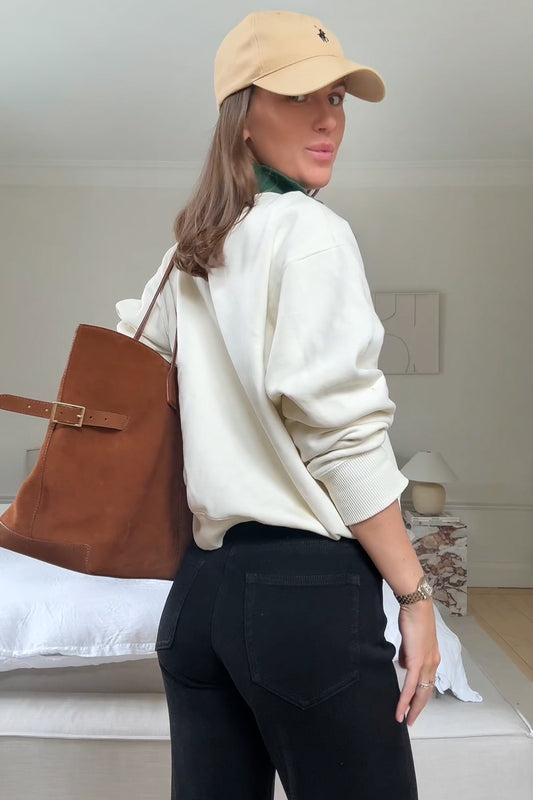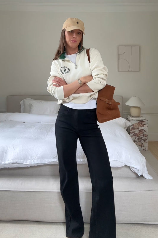 Het model op de foto is 175 cm en draagt maat S met lengte 34".